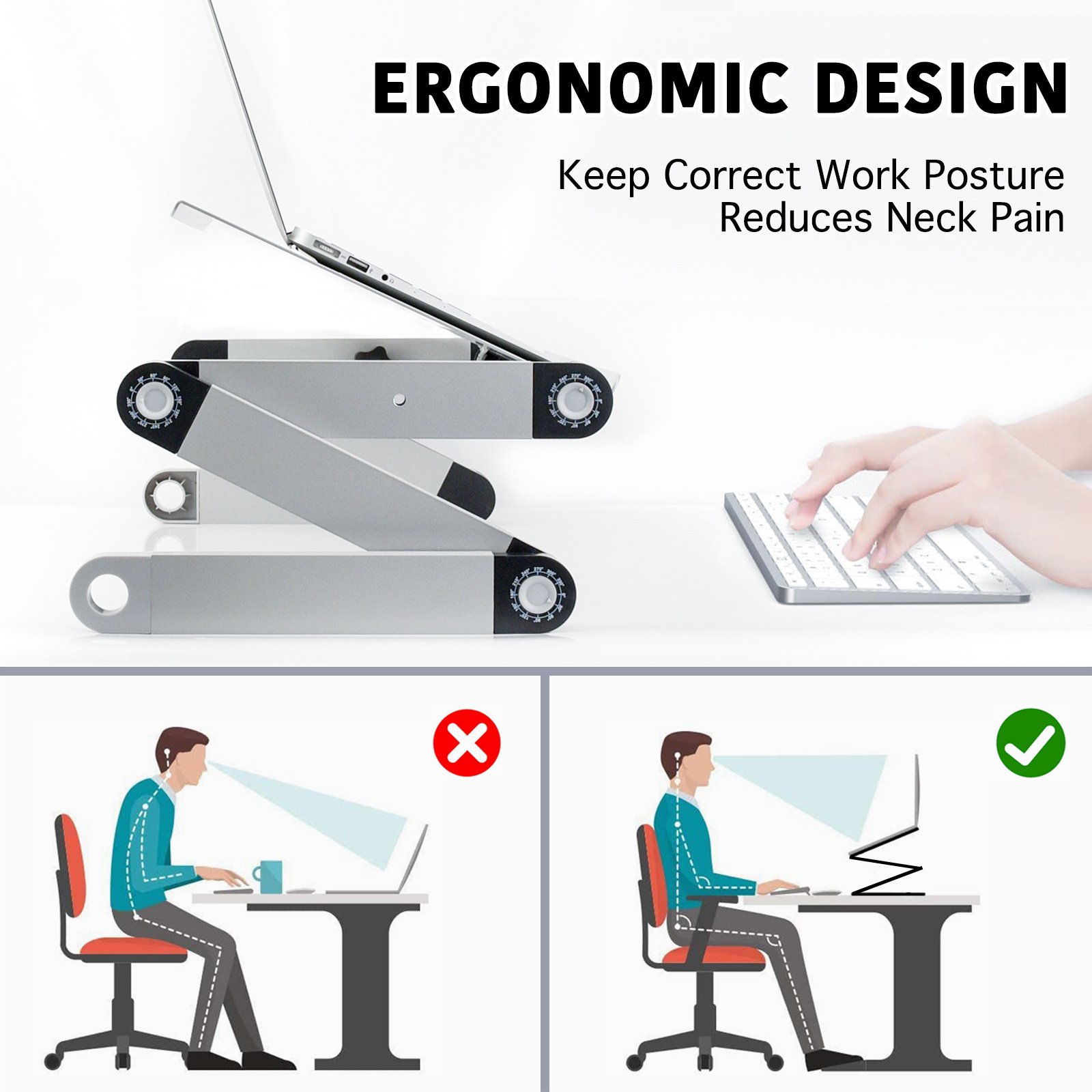 Ergonomic Design】This laptop stand is designed with full control and flexibility for your convenience so that you can use your computer at the most comfortable position. It will reduce neck and shoulder stress due to hours of using your computers, benefits your health and make you free from the neck ache and shoulder pain caused by poor posture.