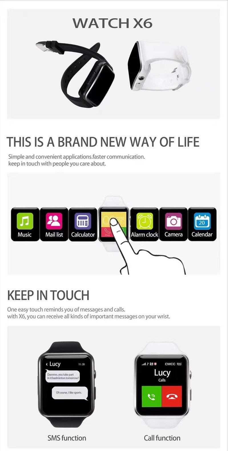Features: Bluetooth, SIM card, phone book, dialing, information, call history, code table, Bluetooth music, photo, remote camera, set to find mobile phone, time and date, ringing vibration, pedometer, theme, clock type, sleep test, Two-way anti-lost, QQ, WeChat, GPRS positioning Facebook, Twitter, WhatsApp